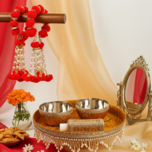 Shagun trays symbolize good fortune, prosperity, and happiness in Indian weddings. They’re a way to bless the couple with a bright future, and the items in the tray, such as rice, sweets, and money, represent abundance, sweetness, and prosperity in their life together.