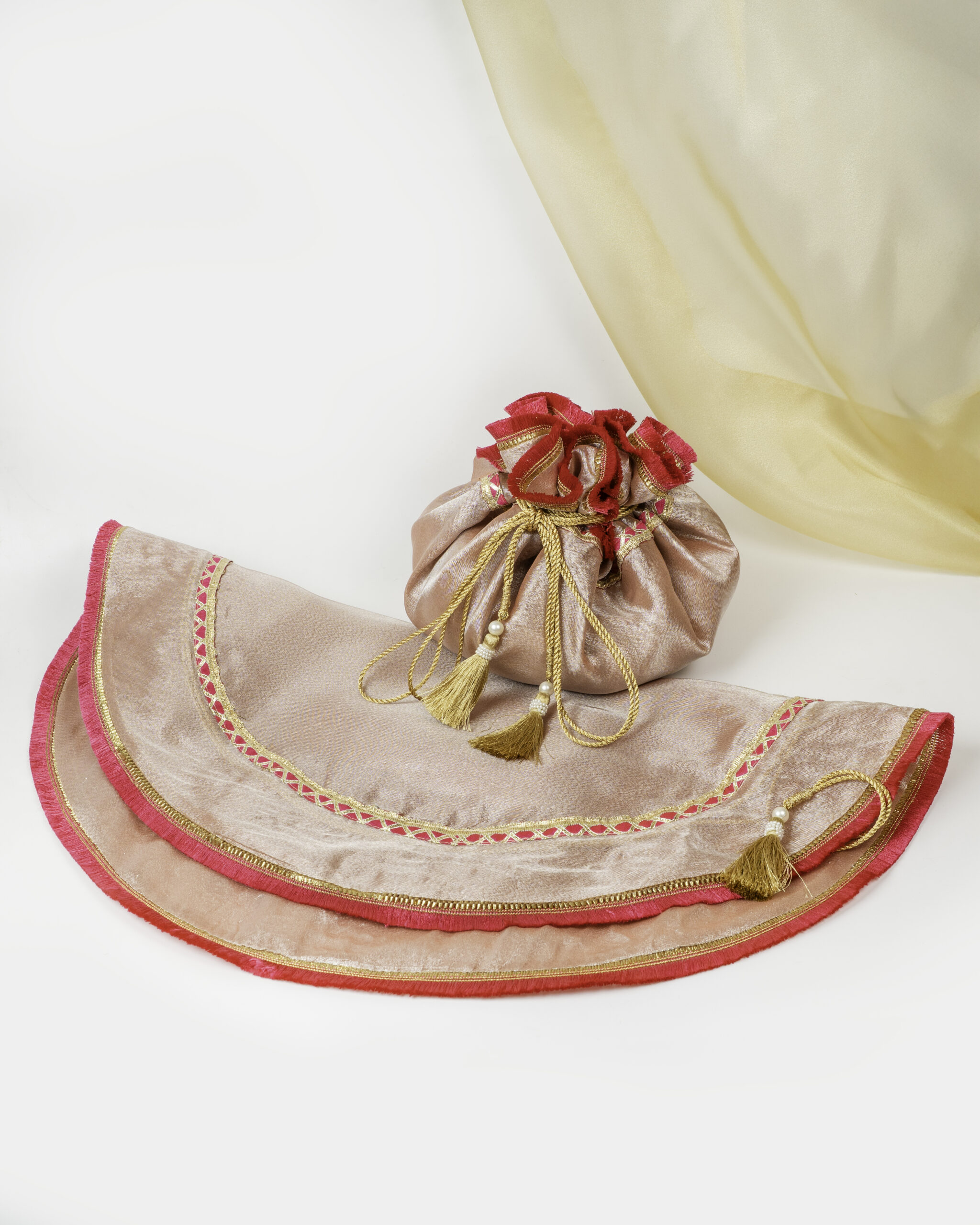 We thoughtfully crafted these pieces to ease the load on bride & groom with this pair of brocade lap covers, hand stitched in brocade & tissue fabric, adorned with golden laces and drawstrings with pearl tassels. The best part? After the rituals, each cover transforms into a chic potli.