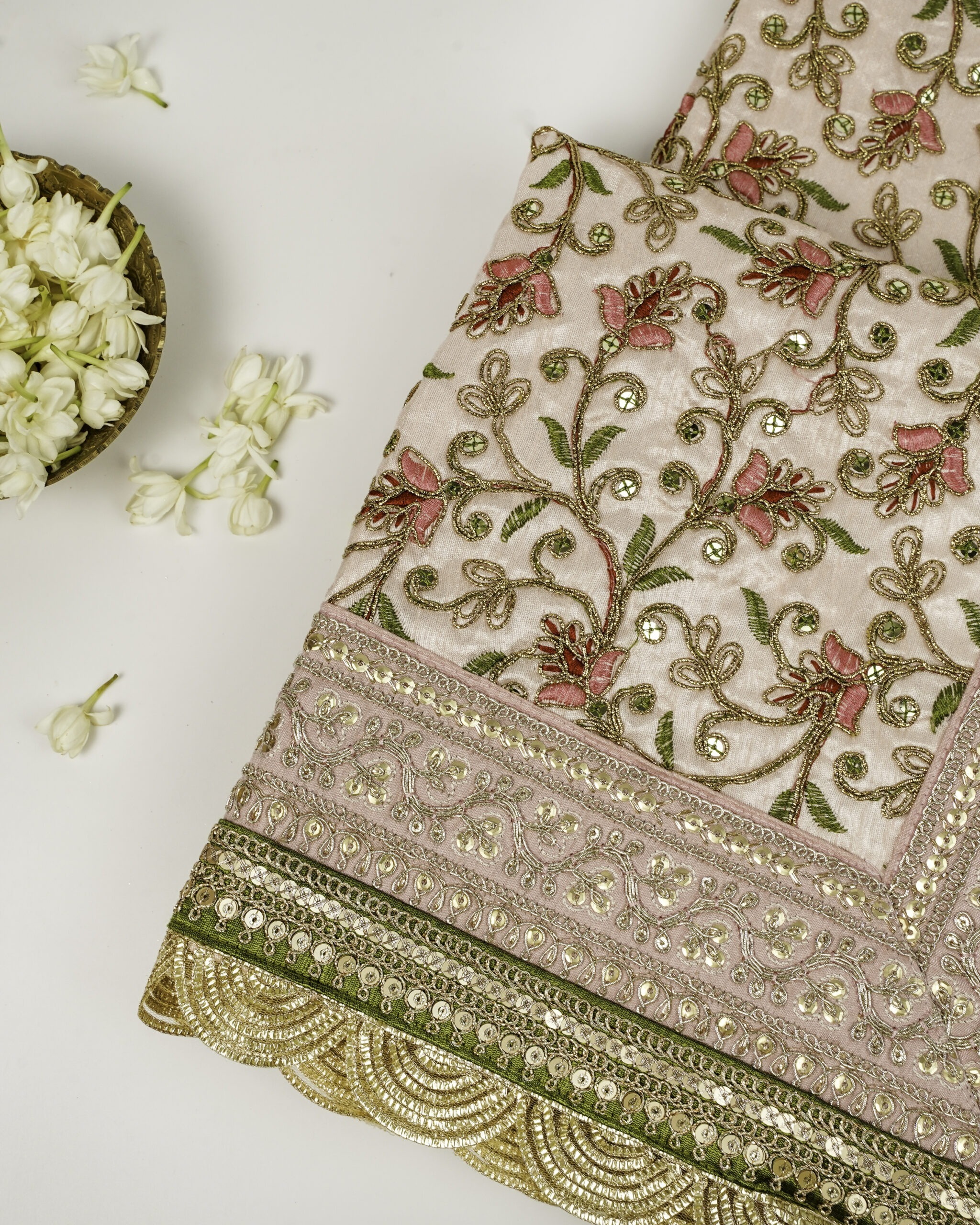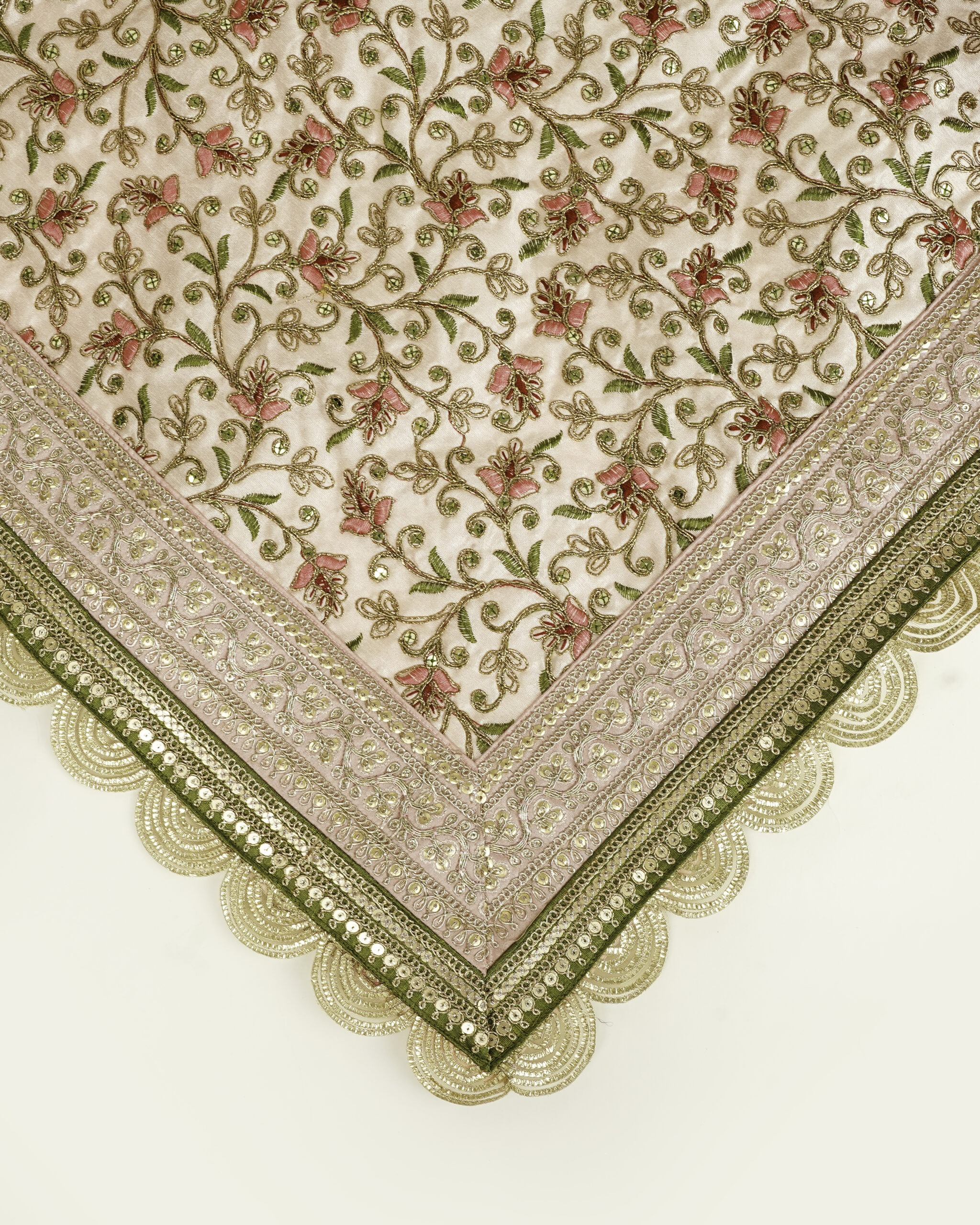 This Rumala Sahib set is beautifully handcrafted in luxurious silk brocade, featuring intricate zari and tilla work along the borders, finished with gold and gota trims for a regal touch.