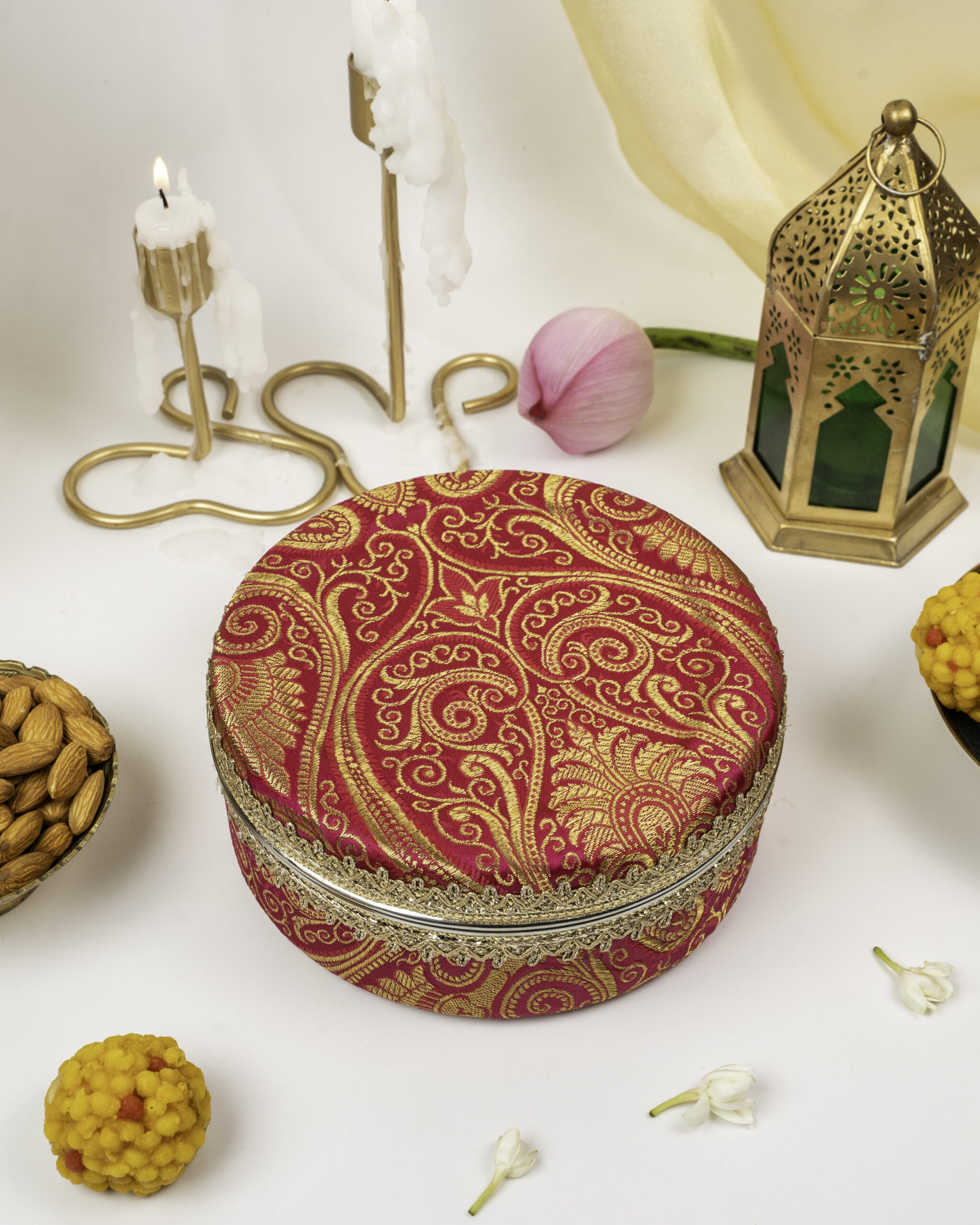 • Gulzaar Paisley Brocade Ladoo Box Small, a wedding product used of sweets storing and gifting purposes in Punjabi weddings, by Navka Studio