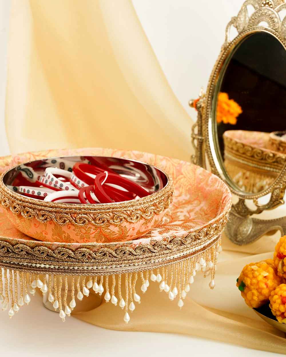 Soft and graceful, wrapped in delicate peach floral brocade finished with matching gota, pearl and bead hangings, this Chura Bowl set brings a gentle charm to your Chura ceremony. It includes a durable stainless steel bowl for both practicality and charm. Carefully designed for the traditional cleansing of chura in milk or kachi lassi, it’s the kind of details that makes your wedding morning moments calm, beautiful and unforgettable.