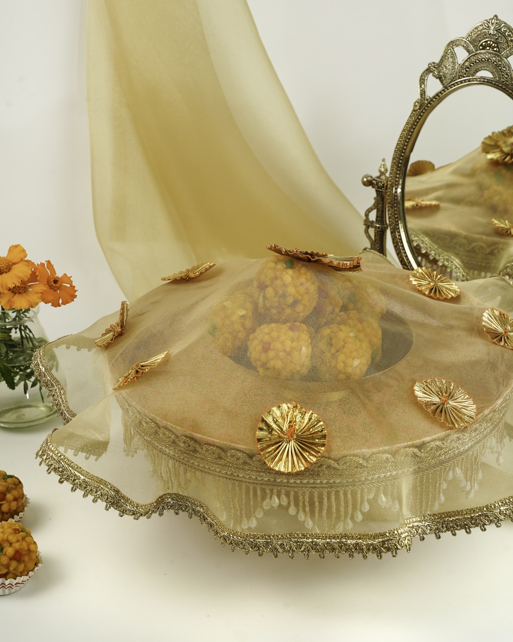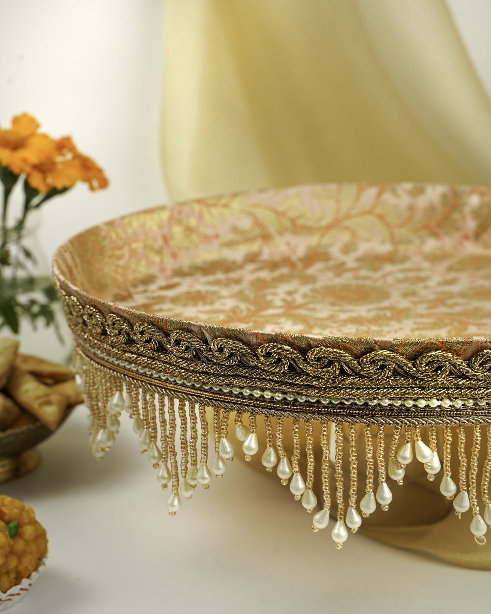 Soft and graceful, wrapped in delicate peach floral brocade finished with matching gota, pearl and bead hangings, this Shagun thaal and golden organza cover brings a gentle charm to your Shagun Ceremony. This thaal is perfect for holding shagun envelopes, sweets or token of love for roka ceremony, to haldi, to shagun, to mehendi to ribbon to wedding ceremony.