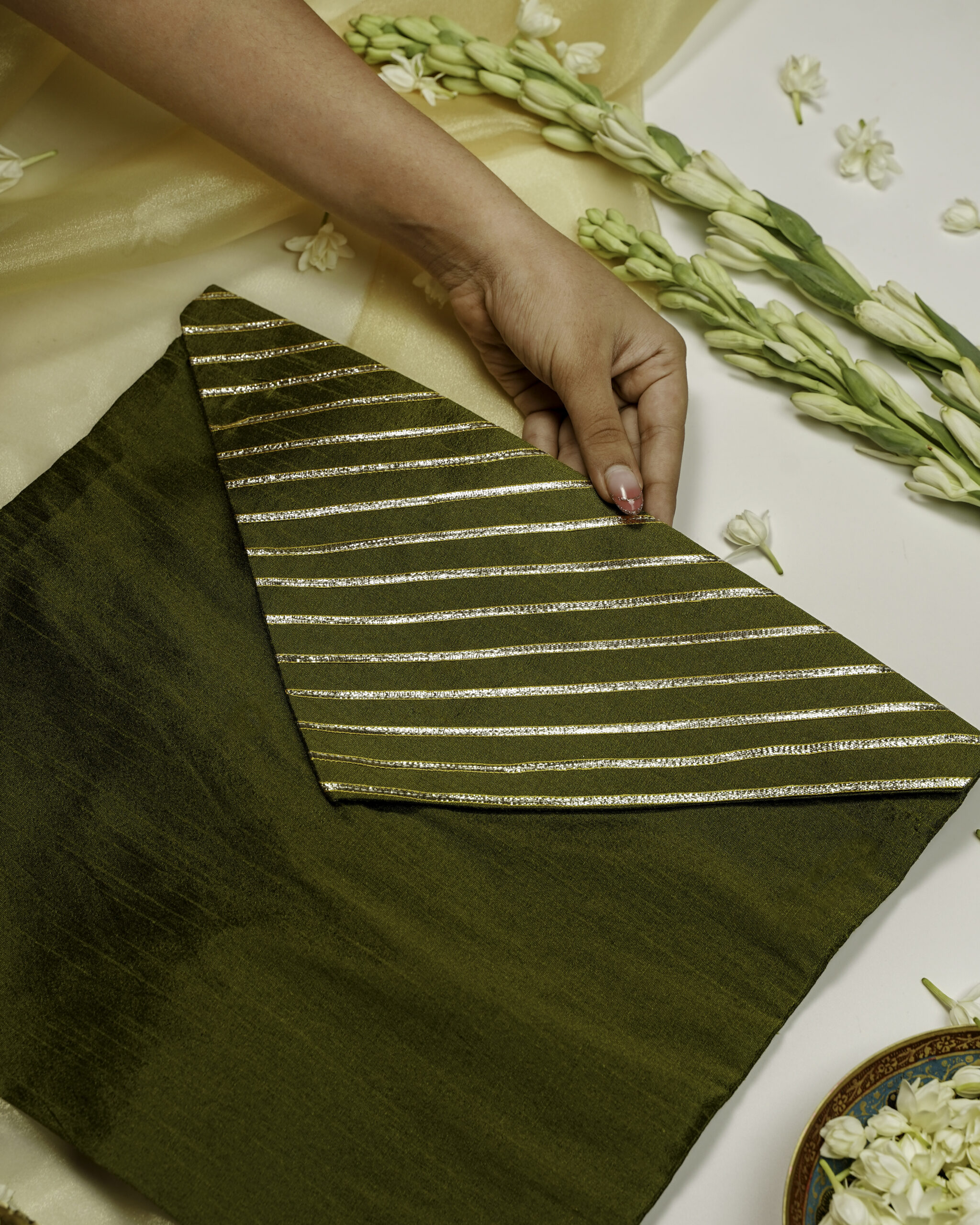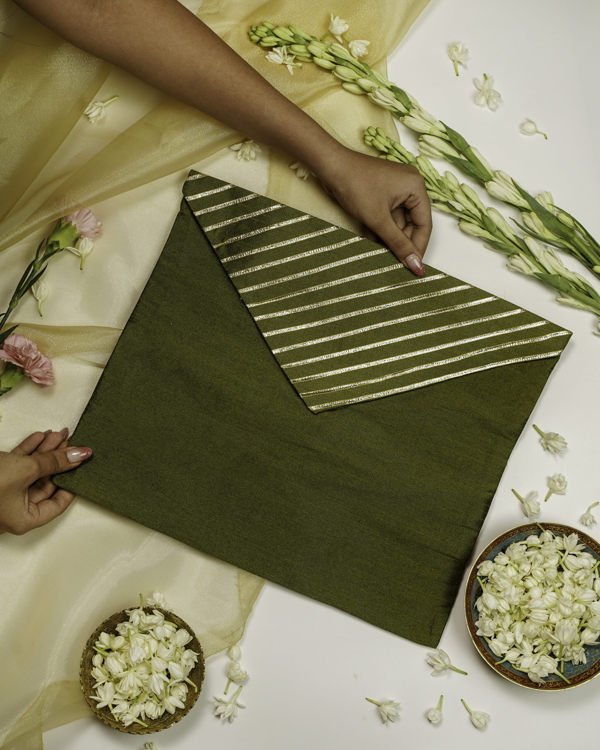 • Close-up of Saawan Silk, Full Gota work with Gold trims, Trousseau Bag, an olive green fabric envelope with a small silver floral button, placed on a golden cloth with white flowers in the background by Navka Studio.