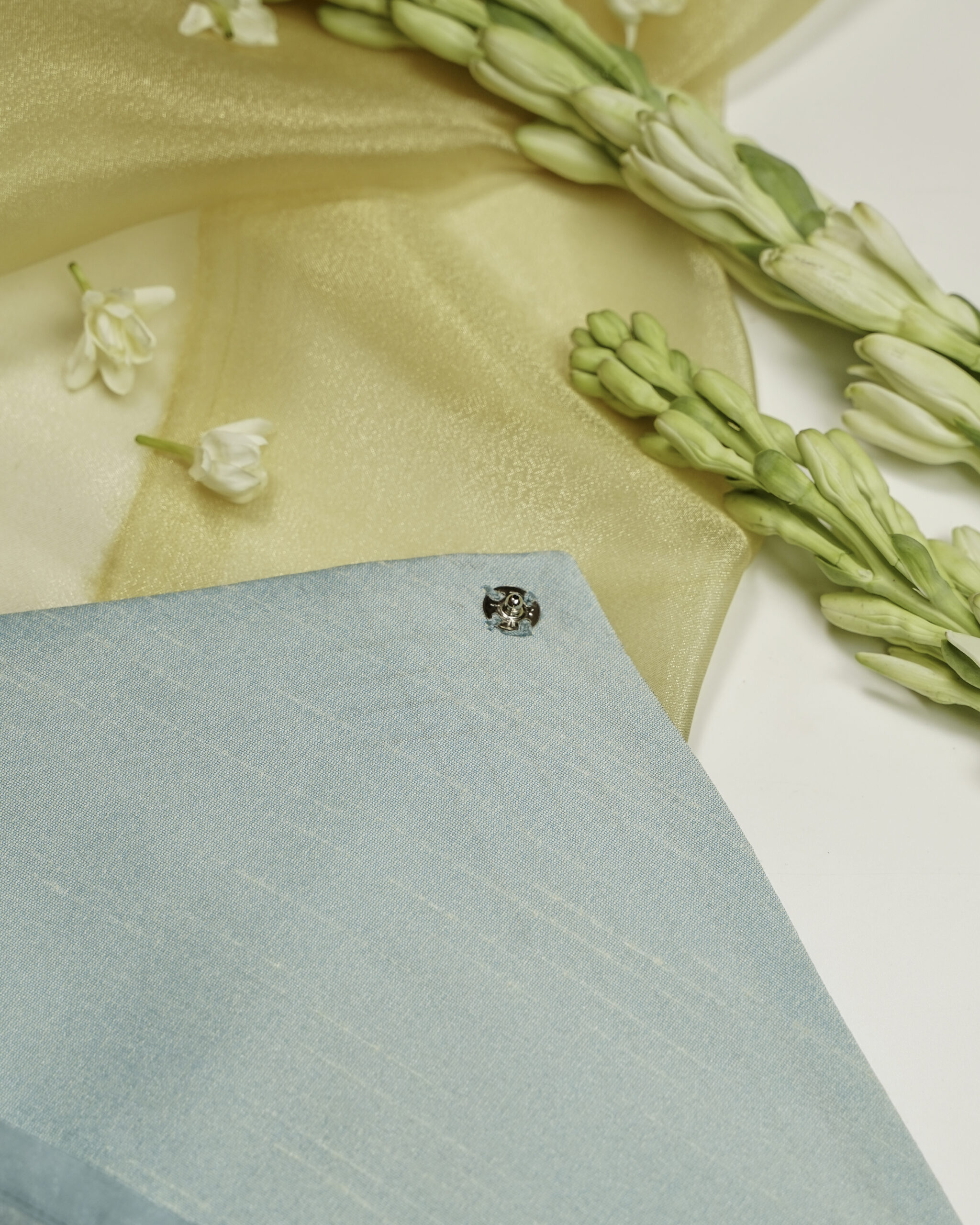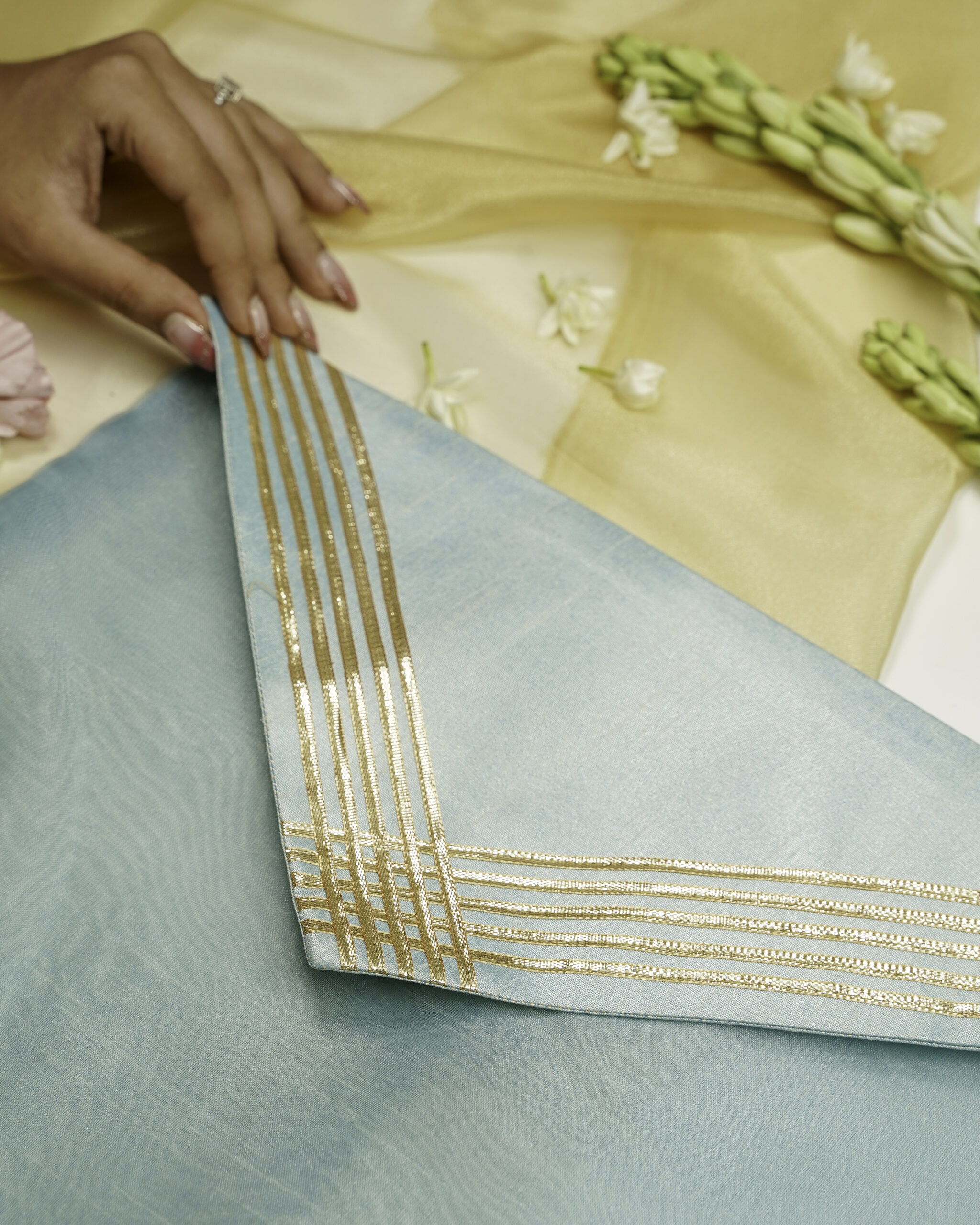 • Two hands displaying Seher Silk, Grid Gota work Trousseau Bag, a light blue fabric envelope with gold striped detailing on the flap, surrounded by white flowers, golden fabric, and bowls filled with petals for a festive presentation by Navka Studio.