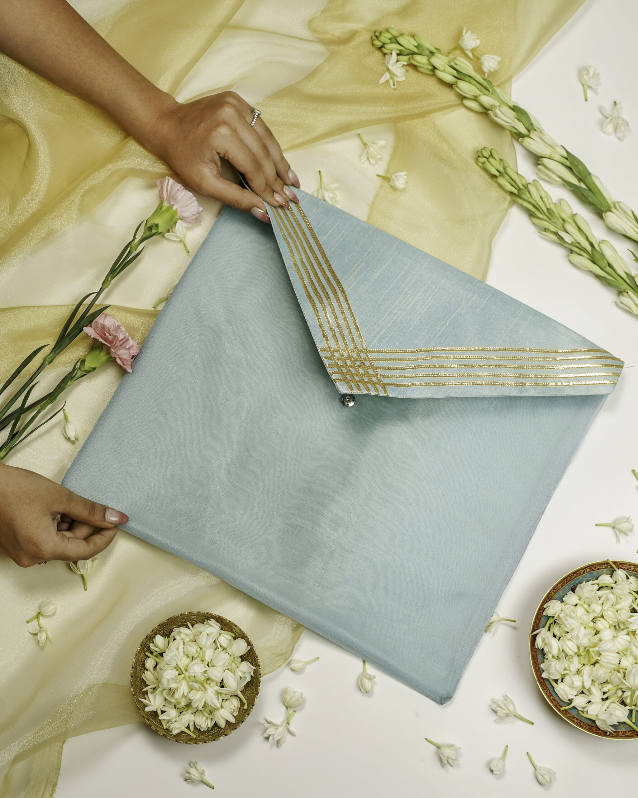 • Seher Silk, Grid Gota work Trousseau Bag, a light blue fabric envelope with gold striped detailing on the flap, placed on a soft golden fabric background decorated with white flowers and buds.