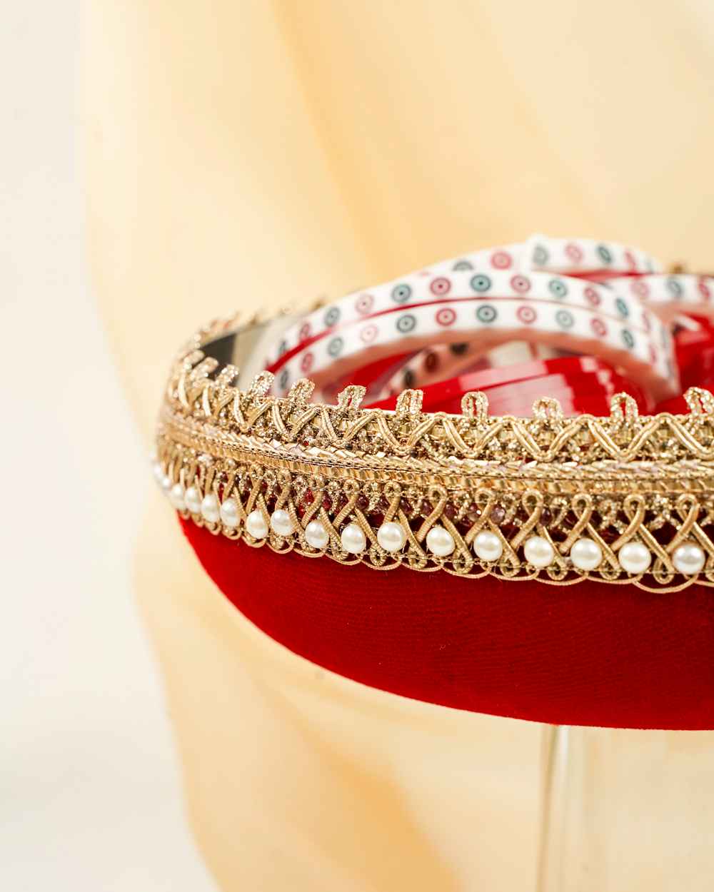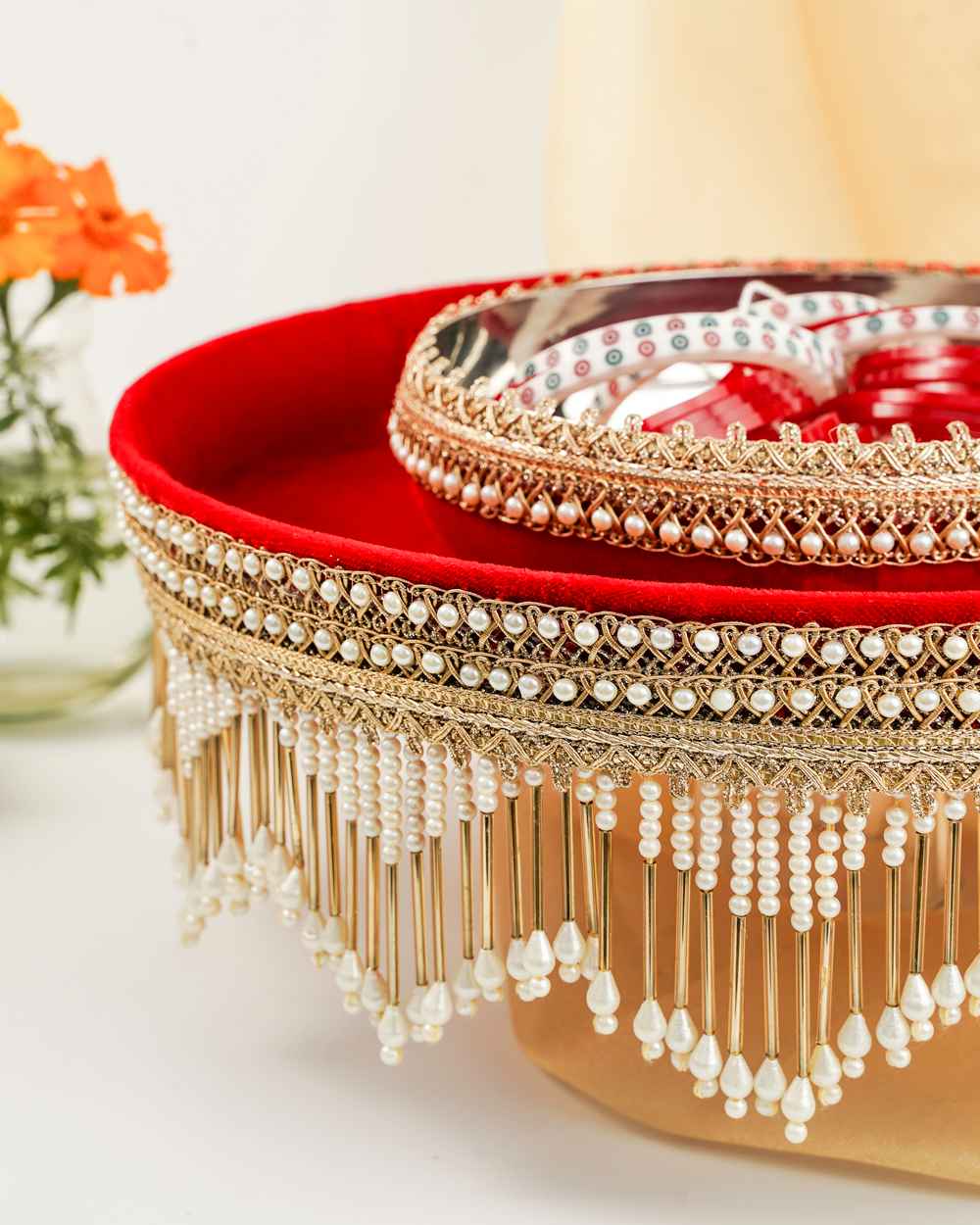 Crafted in plush red velvet and adorned with pearl and bead hangings and gold gota, this Chura bowl set is more than just a ritual essential- it’s a symbol of joy and blessings. Carefully designed for the traditional chura cleansing ceremony with milk or kachi lassi. Rooted in heritage and made with heart, it adds grace to your wedding morning rituals.